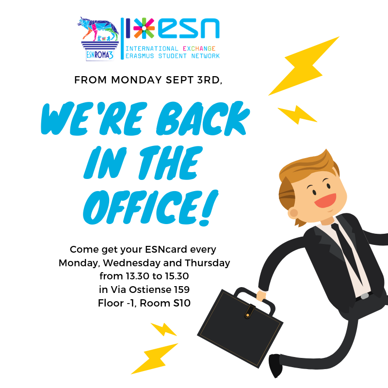 Venite nel nostro ufficio per ottenere la vostra ESNcard, per chiederci aiuto o anche solo per chiacchierare, non vediamo l'ora di mostrarvi tutte incredibili attività che abbiamo in programma per rendere il vostro Erasmus l'anno migliore della vostra vita!!!